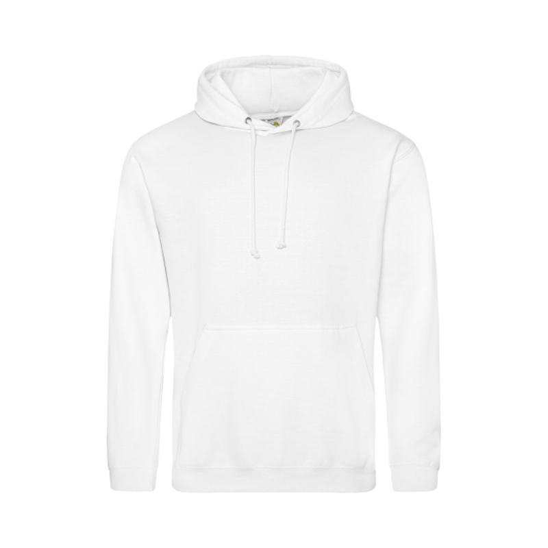 Sweat blanc avec capuche, poche kangourou, et cordon de serrage, idéal pour la personnalisation.